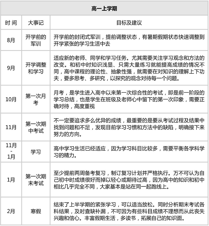 高一上学期学习规划进度表